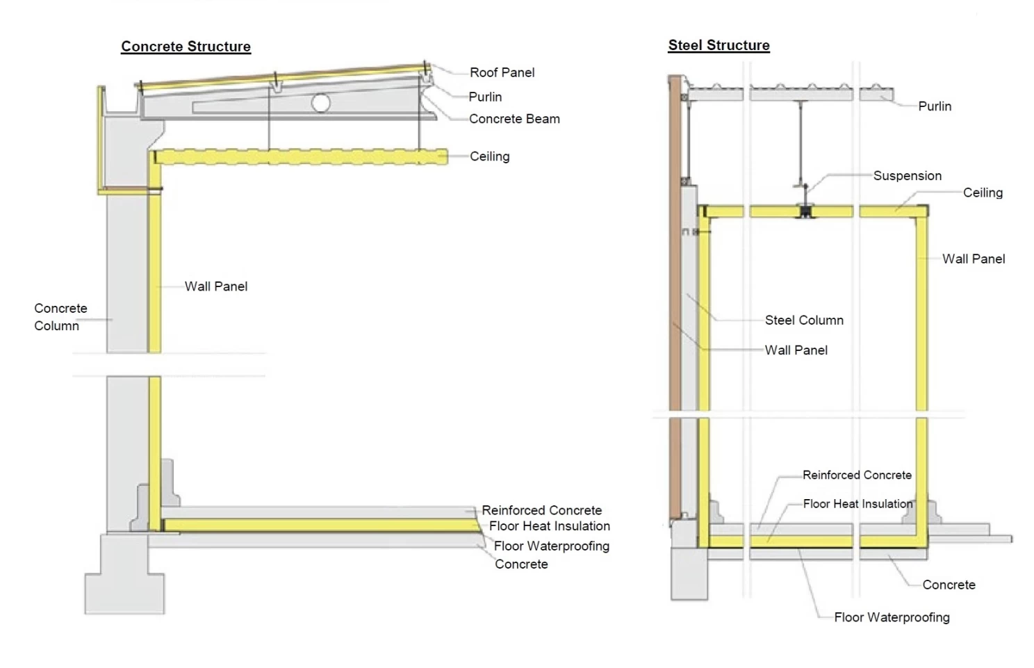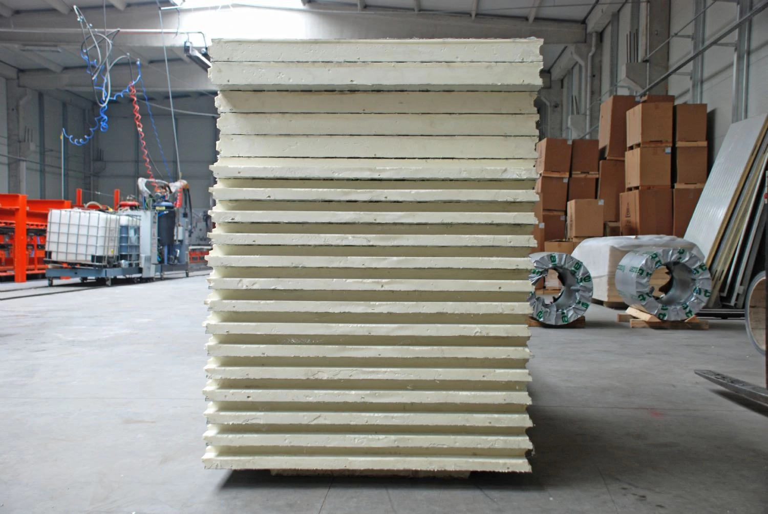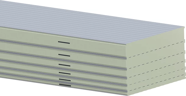 يتم تصنيع الألواح عن طريق حقن مادة البولي يوريثان بشهادة B1 FIRE SAFE CLASS (DIN 4102 FIRE SAFE) المعتمدة، خالية من مركبات الكربون الكلورية فلورية بكثافة 42 كجم/م3 تحت ضغط عالي بين لوحين من الفولاذ المجلفن المطلي بالبوليستر بسماكة 0.50 مم .